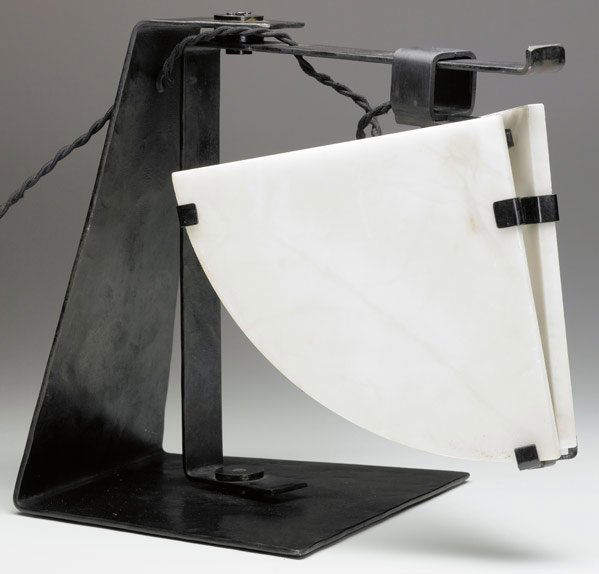 SoldPierre Chareau, 'Nun' Table LampPIERRE CHAREAU'Nun' table lamp, 21st centuryOxidized steel, alabaster. Manufactured by Edition Modern, USA. 19" H x 21.5" W x 12.5" D See Sold Price