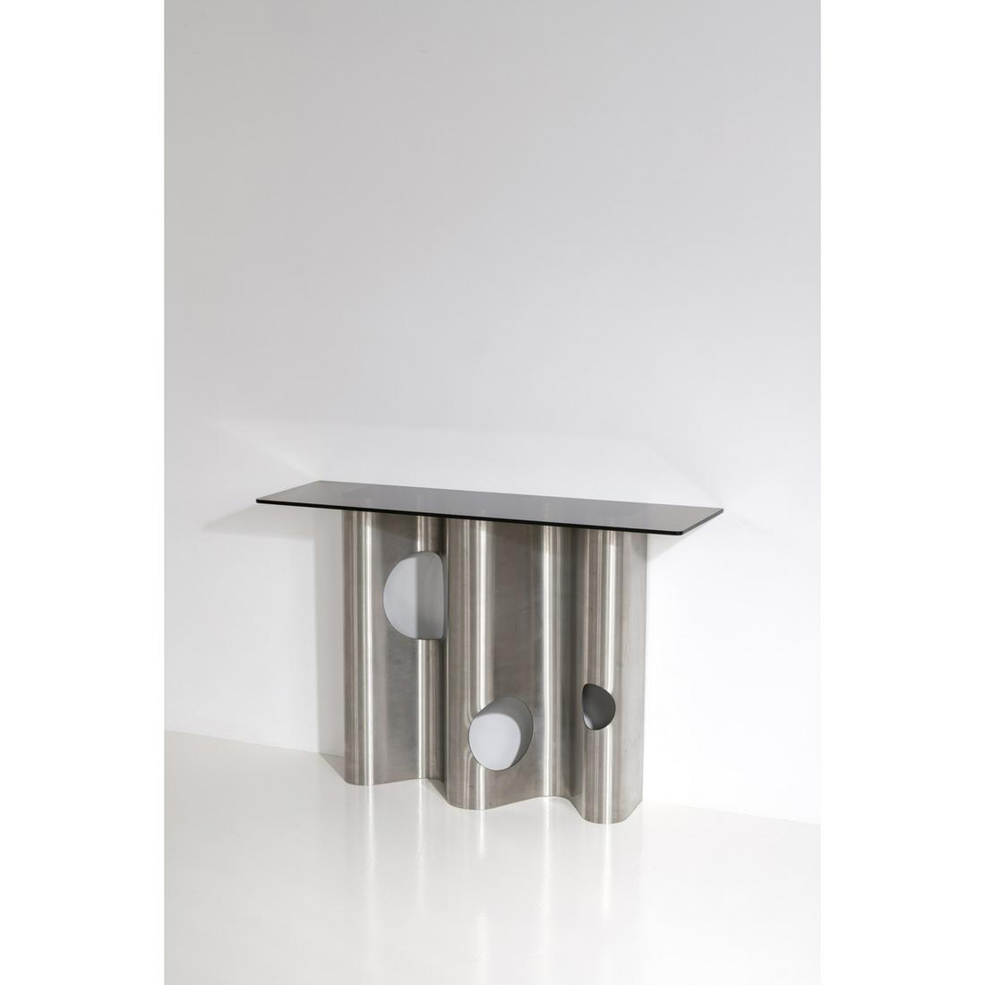 POLISHED STEEL AND GLASS CONSOLE TABLE C 1980. CAN BE USED WITH OR WITHOUT THE GLASS.Kamelot Auctions4.4(346)$5003 days Left