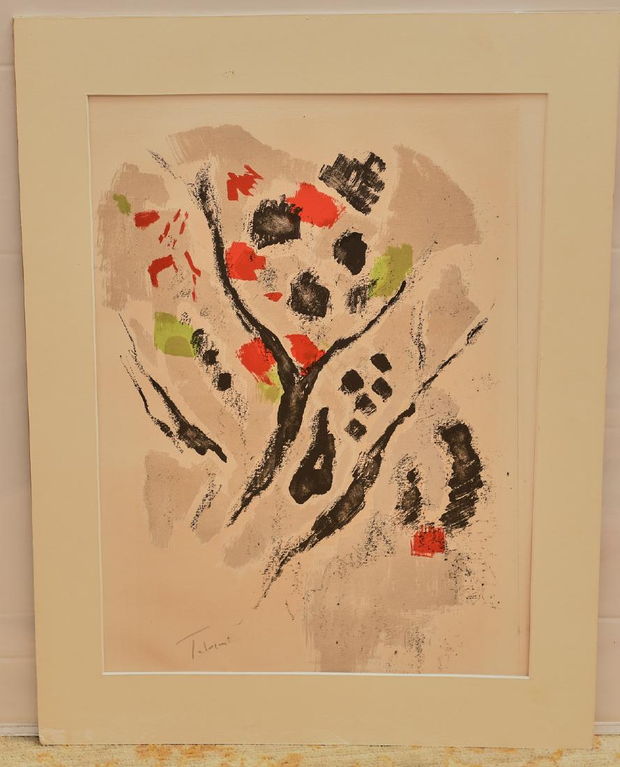 SoldPierre Tal-coat, French, 1905-1985, abstract lithograPierre Tal-coat, French, 1905-1985, abstract lithograph, "Derriere Le Miroir", pencil signed Tal-coat, number 27/300, 15 1/2"h x 29 1/4"w plate, frame 23 1/4"h x 36 3/4"w, good conditionSee Sold Price