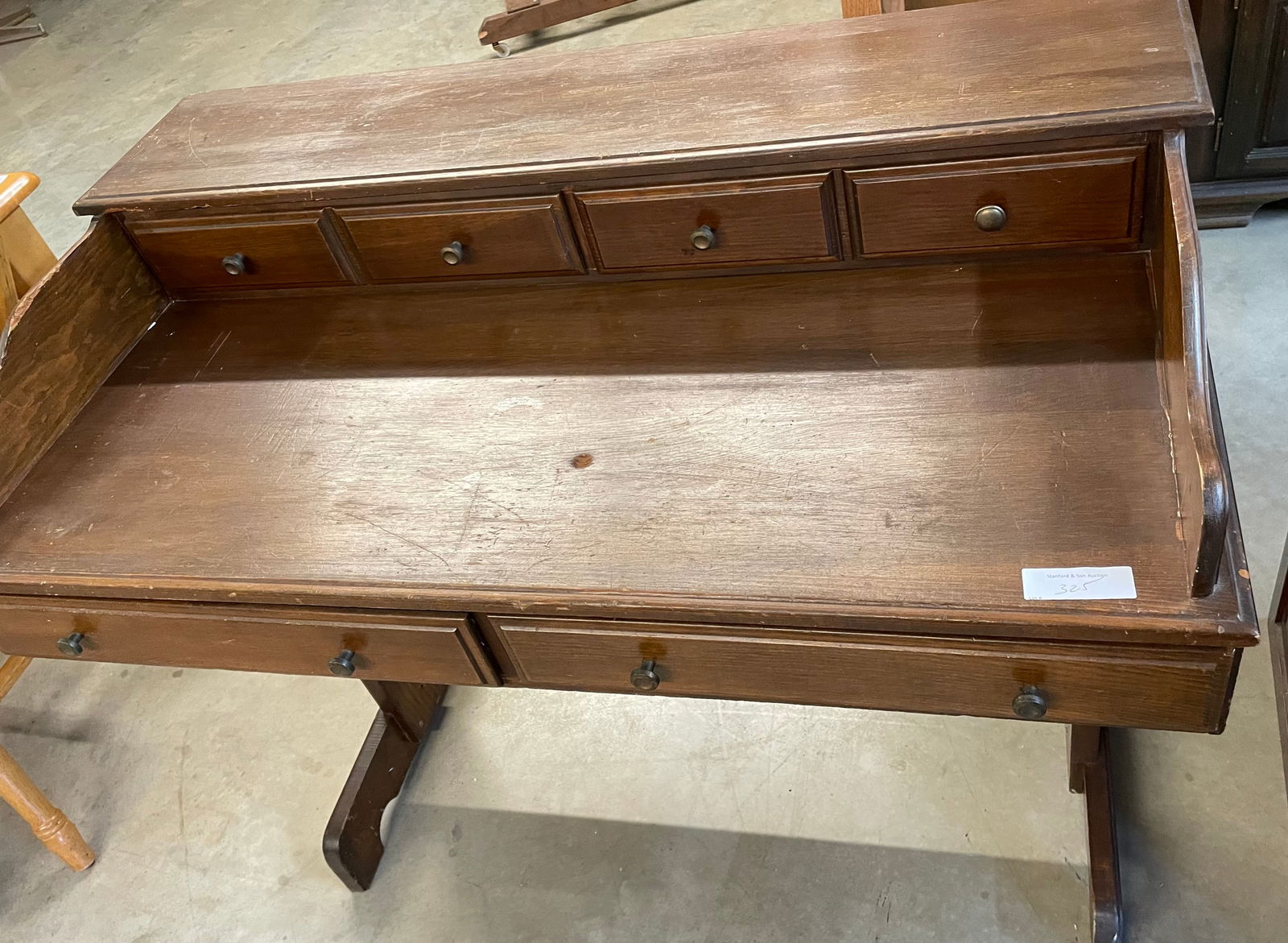 SoldGallery Back Ship Captains DeskOak with a spindle gallery back. 4 side drawers. Good condition. Lid is pine, probably was leather covered.See Sold Price