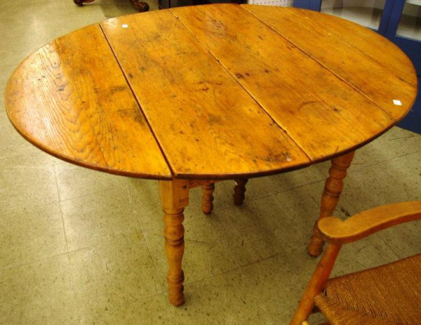 SoldEarly Pine Oval tableThis early oval one drawer pine table has turned legs and pegged construction. In used, refinished condition, it measures 30" tall X 41.5" across X 23" deep.See Sold Price