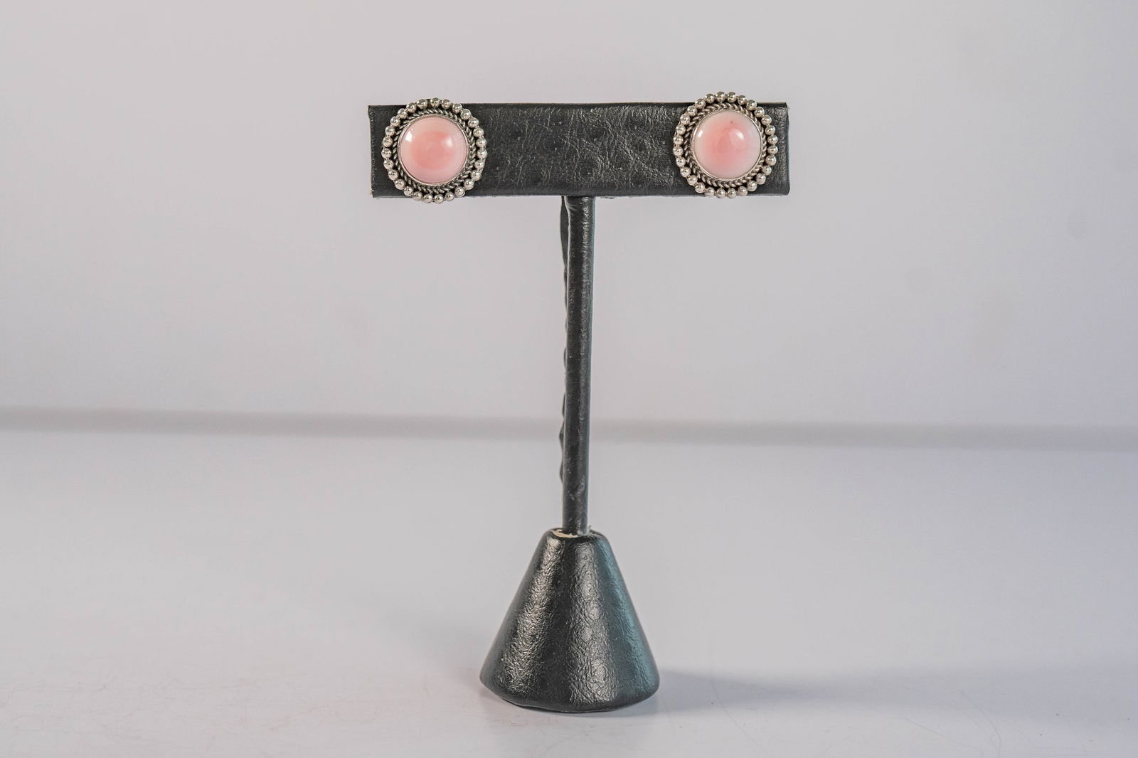 SoldPink Conch Shell Post EarringsNative American Navajo pink conch shell clearing surrounded by sterling silver twisted wire and bead appliques 5/8" round.See Sold Price