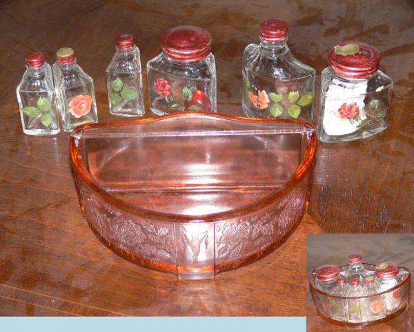 pink depression 7 pc caster set holder w/apple bl