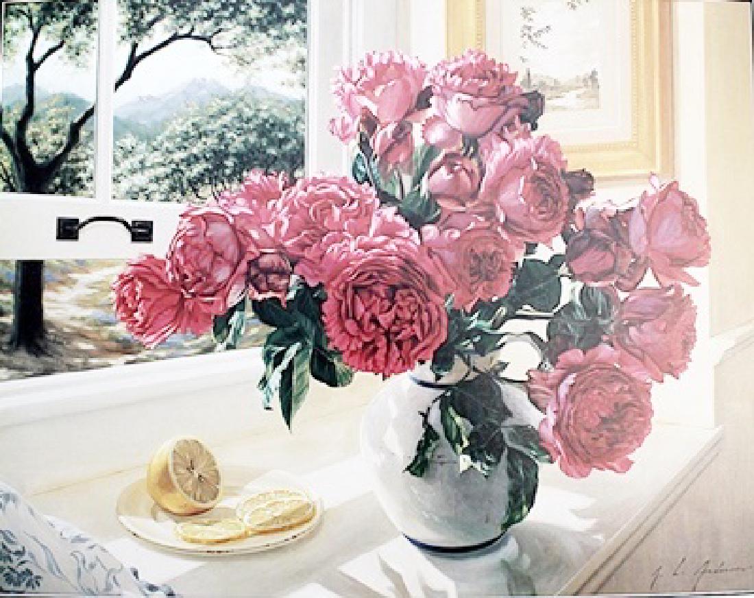 SoldGayle Rovnick Vintage Champagne Bouquet LithographOffset lithograph. Signed in print in lower right corner. Subject depicts a still life watercolor of blush roses and foliage in a teapot. Framed in wooden pink frame. Frame measures approx. 33 x 33 inSee Sold Price