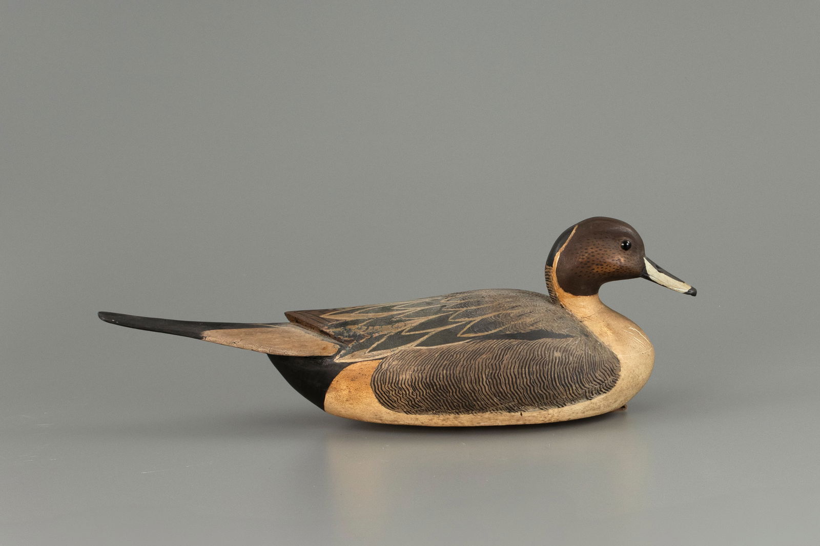 SoldPINTAIL DRAKE by Grayson Chesser, Jenkins Bridge, VA.PINTAIL DRAKE by Grayson Chesser, Jenkins Bridge, VA. Excellent original paint and unused condition. Gunning model carved in a swimming position. Nice painted feather work. “C” carved in bottomSee Sold Price