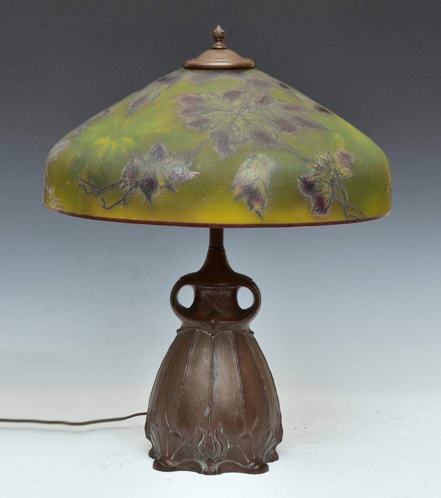 SoldPittsburgh Reverse Painted Lamp c1920Pittsburgh Reverse Painted Lamp c1920. Unsigned. New replaced sockets. Excellent original patina. Original glass in perfect condition. 21.5"h x 16.5"d. Spend $5000 or more at this auction and all of ySee Sold Price
