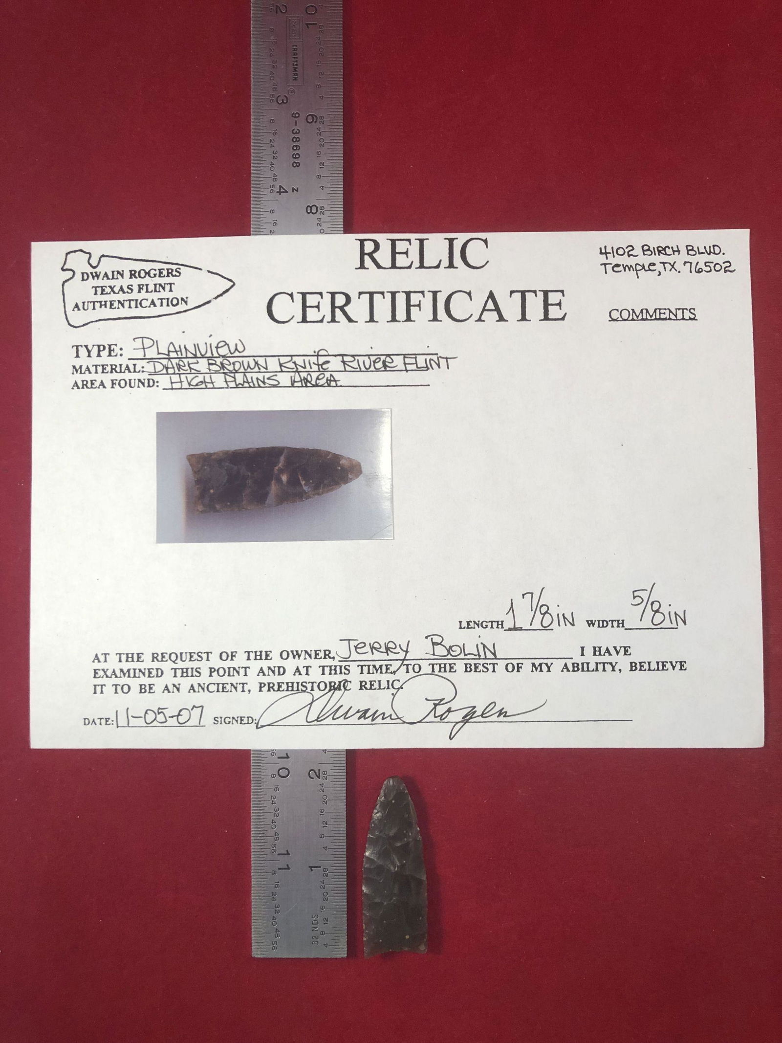 SoldAuthentic Plainview Point Indian Artifact Arrowhead with Rogers COAThis treasure was recovered from The Texas Hill Country a few years ago. It is from Kerr County and was made from brown and gray Edwards Plateau Flint. The point is 2 1/8" long and 15/16" wide.See Sold Price