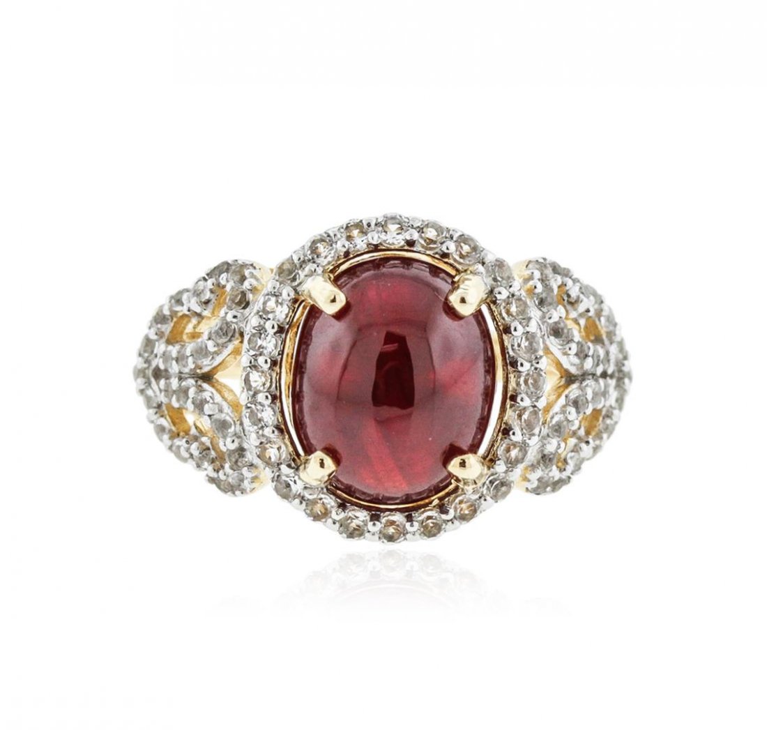 SoldSILVER RING WITH RUBY AND WHITE TOPAZStone : RUBY Metal : SILVER Cts: 2.00 Finish : POLISHED shape : OVAL Gmwt: 7.50 color: RED, Size: 8, Stone: WHITE TOPAZ cts: 0.50See Sold Price