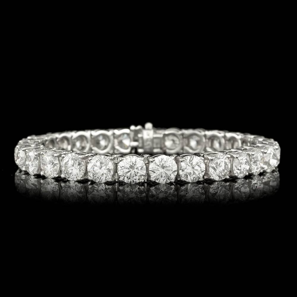 SoldAn important platinum diamond braceletAn important platinum diamond bracelet (7"L) set with 21 brilliant cut diamonds, each diamond wt. approx. 0.50ct, tdw approx. 10ct, wt. 42.5gmSee Sold Price