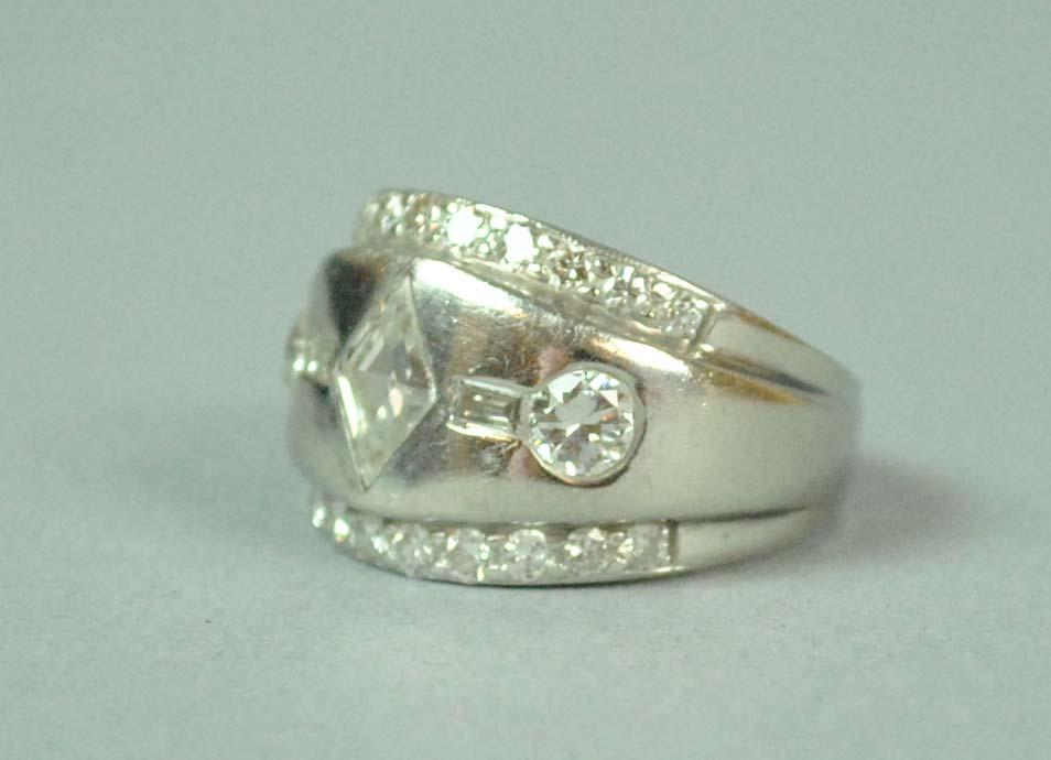 SoldArt Deco Platinum Diamond Dome RingMETAL: Platinum. MEASUREMENTS: Ring size - 7 1/2, ring top - 16mm wide. GEMSTONES: Diamonds - approx. 2.40ctw. MARKED: 10% irid. plat. WEIGHT: 6.8 grams.Gemstones have not been graded for color and clSee Sold Price