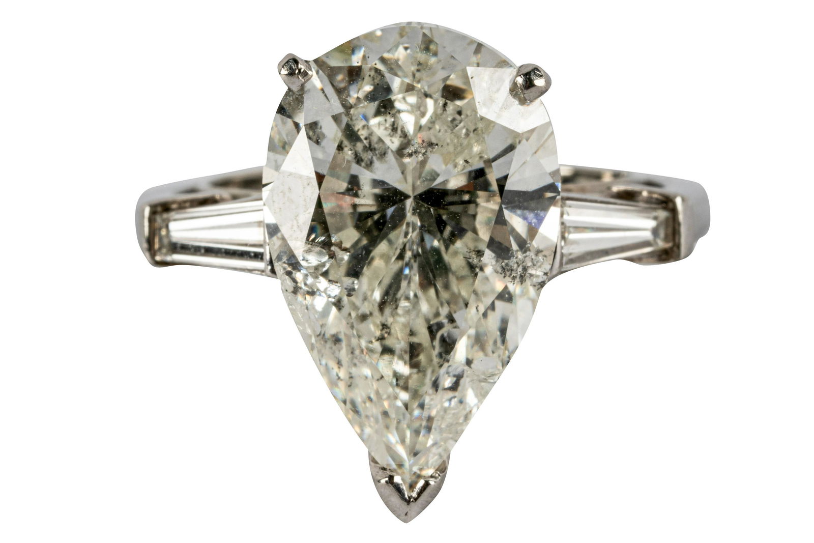 SoldPLATINUM & DIAMOND RINGcentering one round brilliant cut diamond [I/SI1] weighing 5.72 carats, with GIA report no. 5212392624; and two pear shape brilliant cut diamonds [H/VS] weighing approximately 0.56 and 0.57 carats eacSee Sold Price