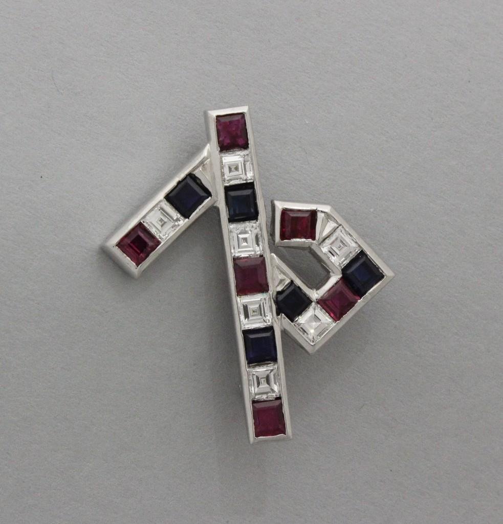 SoldEstate 18k White Gold Diamond Ruby Sapphire BroochEstate 18k White Gold Diamond Ruby Sapphire Brooch. Quality American Flag brooch made in 18kt white gold set with diamonds, rubies and sapphires. Approximately 3.5 carats total weight. Measures 1.5 xSee Sold Price