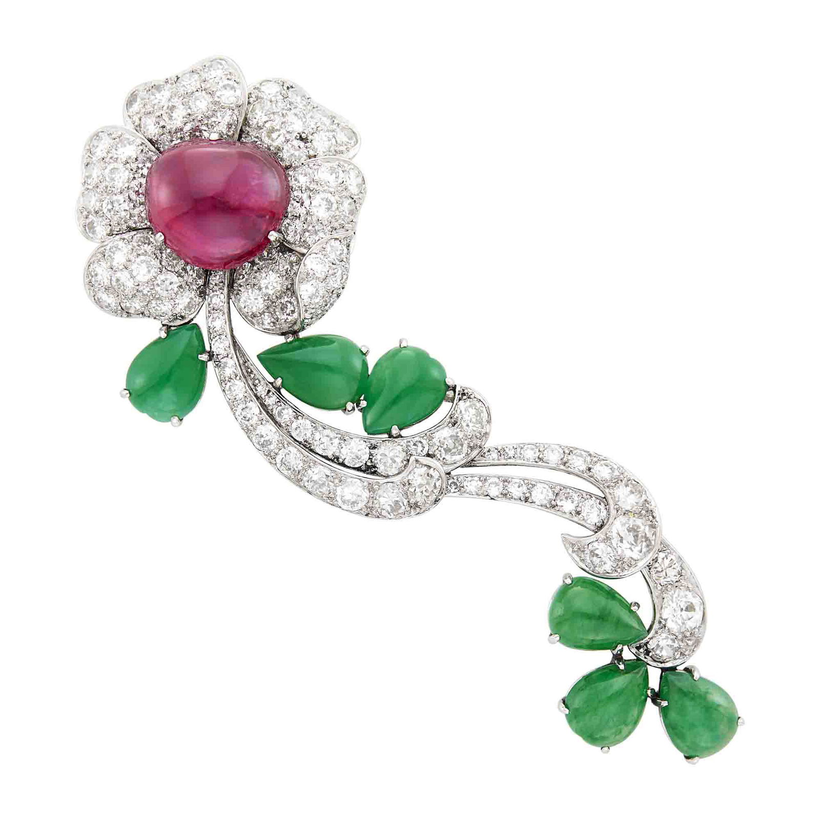 Platinum, Cabochon Ruby, Jade and Diamond Flower Brooch