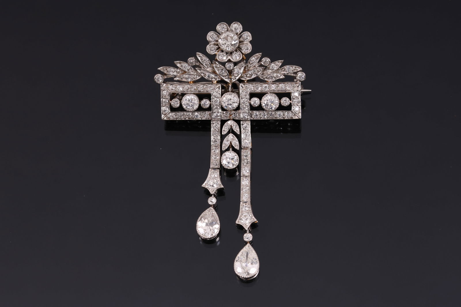 SoldPlatinum Diamond Pendant BroochMETAL: platinum. GEMSTONES: diamonds-approx. 1.60-1.70ctw. MEASUREMENTS: pendant/brooch measures 52mm long x 40mm at widest point. MARKED/TESTED: 1, tested platinum. WEIGHT: 7.6 grams.Gemstones have nSee Sold Price
