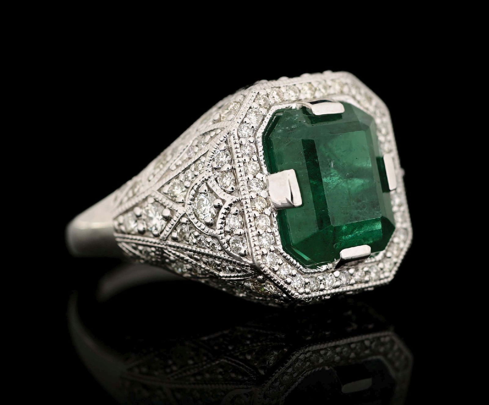 PLATINUM EMERALD AND DIAMOND RING W/ REPORT