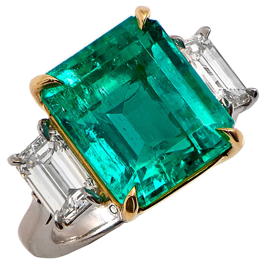 Platinum Emerald and Diamond Three-Stone Ring, 9.84 cts