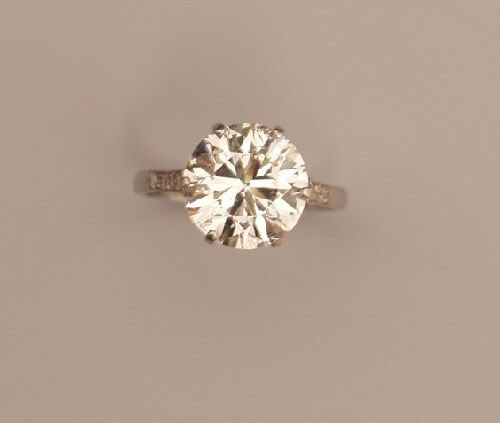 SoldA diamond solitare,A diamond solitarecentering an old European-cut diamond weighing 3.18 carats, flanked by baguette and round brilliant-cut diamonds, mounted in platinum.Size: 7 1/4 (arthritic shank)See Sold Price