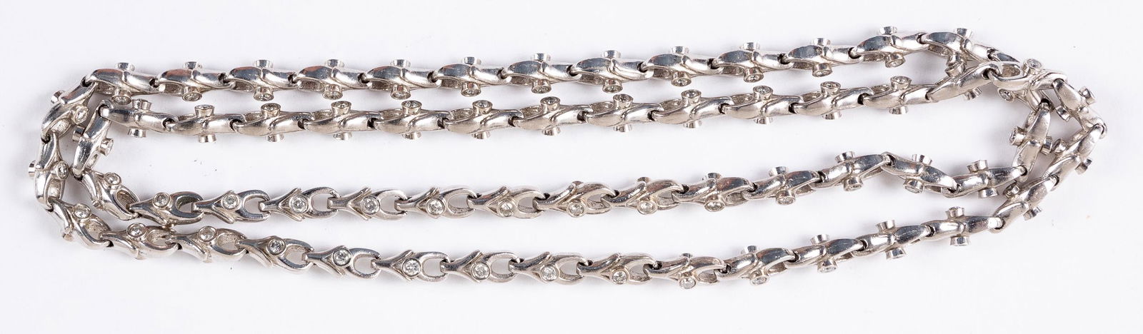 SoldSapphire, diamond, and platinum necklaceSapphire, diamond, and platinum necklace The chain set with stations of rectangular-cut sapphires and round brilliant-cut diamonds Platinum 32.50 in; Gross weight 8.4 dwts This work will ship from LamSee Sold Price
