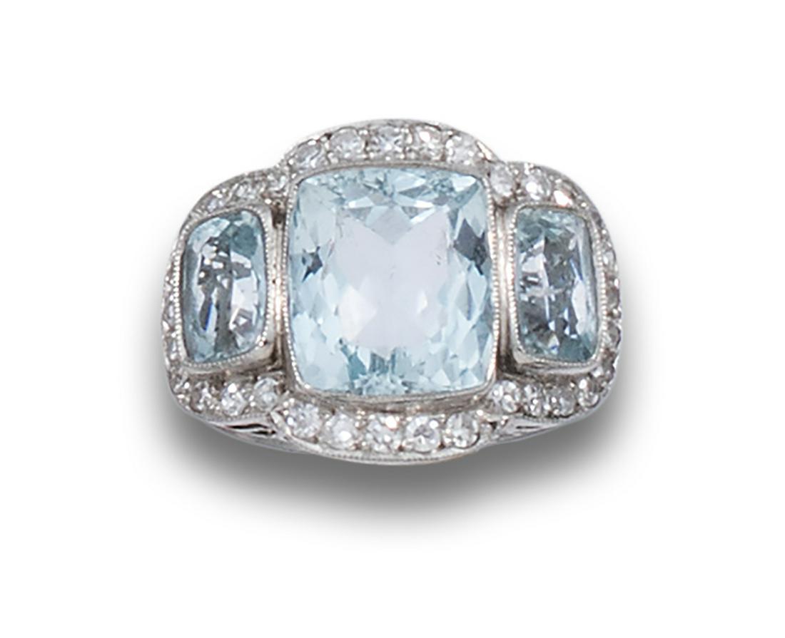 PLATINUM RING WITH AQUAMARINES AND DIAMONDS
