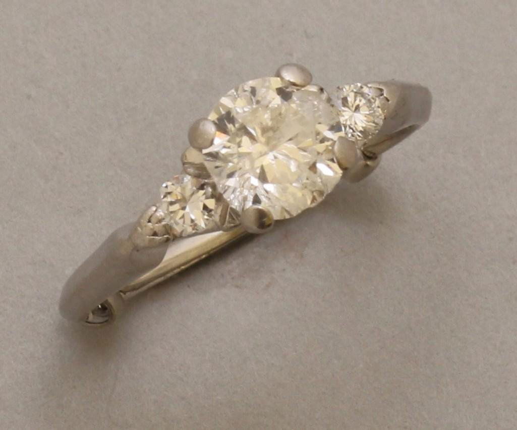 SoldPlatinum Ring with Diamonds900 PLAT 100 IRID. Features (1) 4.0mm round Diamond flanked by (2) 2.36mm round Diamonds, approx. 0.33ctw. Size 6 1/4. 3.5gtw.See Sold Price