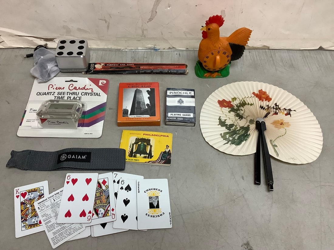 Playing cards, rooster kitchen timer, bluetooth speaker, all purpose bar knife, and more