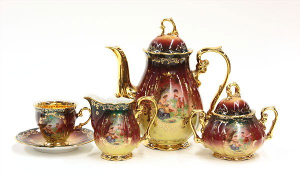 8 pc Lot Bavarian Hand Painted PorcelainMar 01, 2026Lot 19th C. Most. English Porcelain Cups & SaucersFeb 28, 20265 pc Lot Hand Painted Porcelain Bavaria & MoreMar 01, 2026Lot of Empire porcelain gilt cups and saucers. 1) Gilt ground with raised white beaded border.Mar 01, 2026(32) JAPANESE PORCELAIN TEA SERVICE & CHINESE FAMILLE ROSE PLATES1 day LeftWilliam Hunter 1842 Sterling Teapot Set of ThreeFeb 28, 202617-Piece Royal Doulton Coffee Pot, Cups, & Saucers - The Chelsea Rose Pattern1 day LeftRoyal Vienna Coffee and Tea Service6 days LeftKPM, Berlin. Five Royal Ivory teacups with saucers in cream-colored porcelain with gold decoration.Meissen coffee pot, sugar bowl and cream jug with hand-painted flowers and gold decoration. LidsKPM, Berlin. Six Royal Ivory tea cups with saucers in cream-colored porcelain with gold decoration.KPM, Berlin. Seven Royal Ivory tea cups with saucers in cream-colored porcelain with goldRosenthal Sans Souci coffee pot, sugar bowl and cream jug. Hand-painted flowers, foliage in reliefSevres Porcelain Tea Set, 7 Pcs.5 days LeftTete-a'-tete coffee service6 days LeftMeissen, Etc. Porcelain Tableware, 5 Pcs.Mar 12, 2026