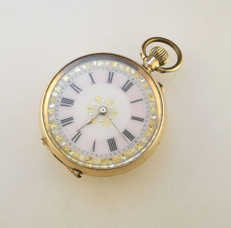 9 ct Gold & Enamel Ladies Pocket Watch - back hinge needs attention.