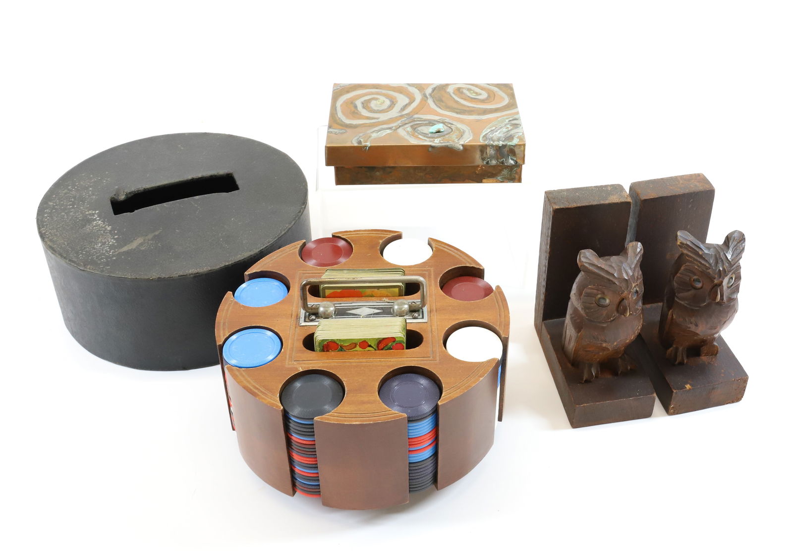 POKER CHIPS, BOOKENDS, COPPER BOX