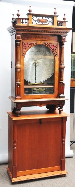 SoldLarge Polyphon Disc-Changer Case, c. 1900Large Polyphon Disc-Changer Case, c. 1900 Polyphon Musikwerke, Leipzig. For 24 ½-inch disc mechanism, walnut case 33 ½ x 20 ½ x 50 in. Großes Polyphon-Wechsler-Gehäuse, um 190See Sold Price