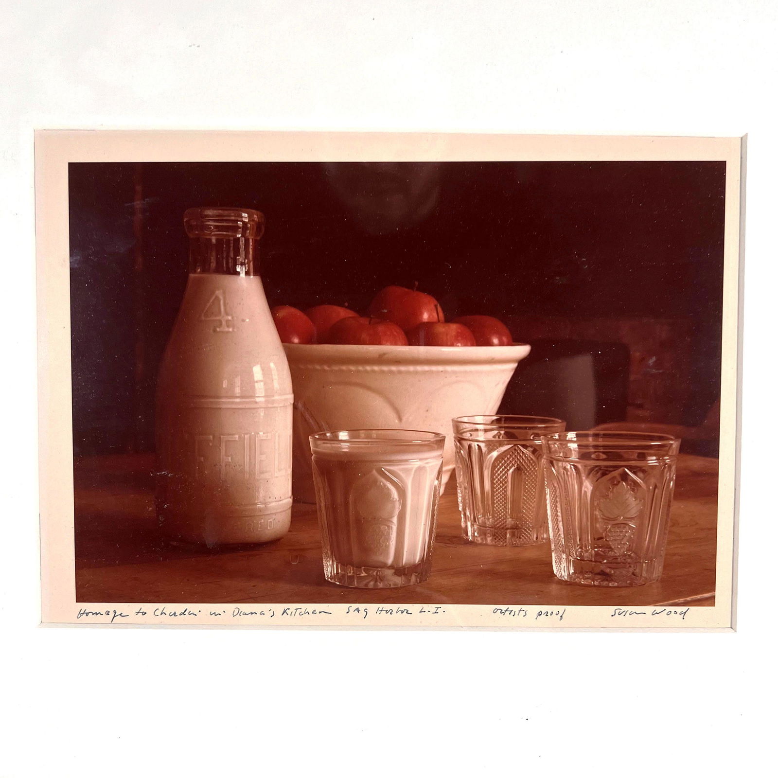 SoldSusan WOOD: "Homage to Chardin..." - PhotographSusan Wood (American, b. 1932) color photograph titled "Homage to Chardin in Diana's Kitchen - Sag Harbor, L.I." depicting a table still life with apples and milk, signed and titled to bottom margin,See Sold Price