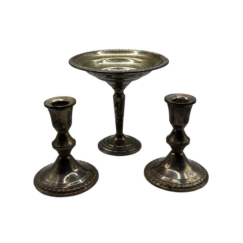 Poole Sterling Silver Candlesticks and Sterling Compote Dish