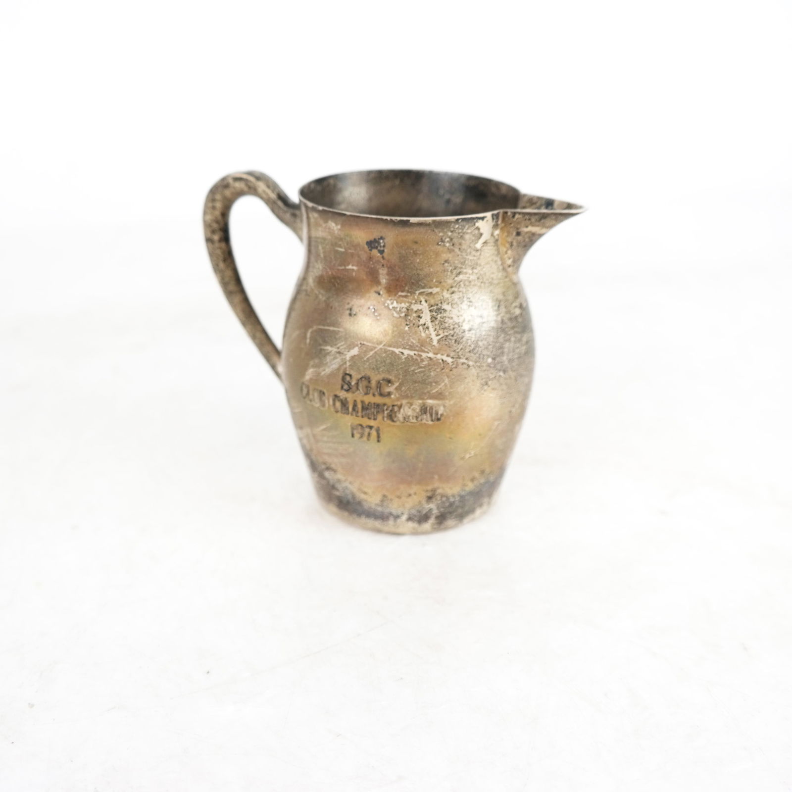 SoldPoole Sterling Silver President's Trophy Pitcher.The front of the trophy is engraved; it reads, "CBC 1965 President's Trophy Winner A. Metzker". There are some light scratches and signs of tarnish; overall, it looks to be in good condition. It measuSee Sold Price