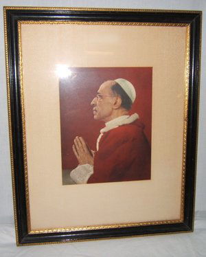 SoldPope Pius XII Minature Guache 800 Silver FrameA miniature Gauche of Pope Pius XII in an ornate 800 silver frame. 2.25"H x 2"W. Condition report: Good - 2 corners of frame are broken off. Please examine all photos closely. Contact C. Biddle AuctioSee Sold Price