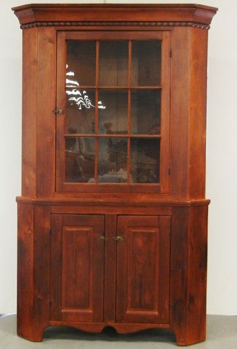 SoldMiddle TN 16 Pane Cherry Corner CupboardLarge Middle Tennessee cherry corner cupboard, poplar primary. Single case construction with an ogee and dentil molded cornice, canted and molded edge sides, two glazed eight-pane upper doorSee Sold Price