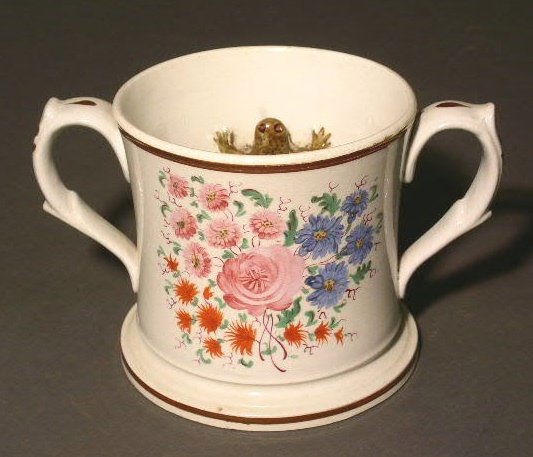 Porcelain double-handled mug with frog decoration.