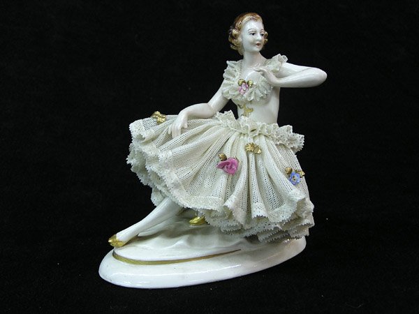 SoldGerman Porcelain & Lace Dresden Ballerina FigurineGerman Porcelain & Lace Dresden Ballerina Figurine. There are some chips to the lace. Signed on the backside of the base. Dimensions (in): 10.5 x 6.25 x 5.75.See Sold Price
