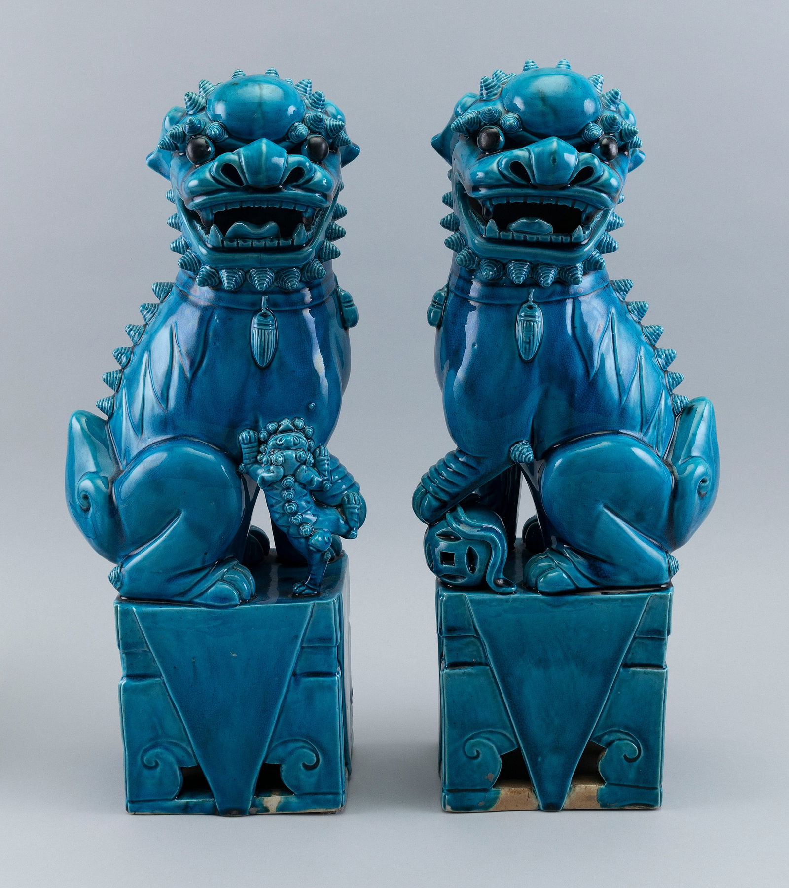 PAIR OF CHINESE TURQUOISE GLAZE PORCELAIN FU DOGS Late 19th Century Heights 19".