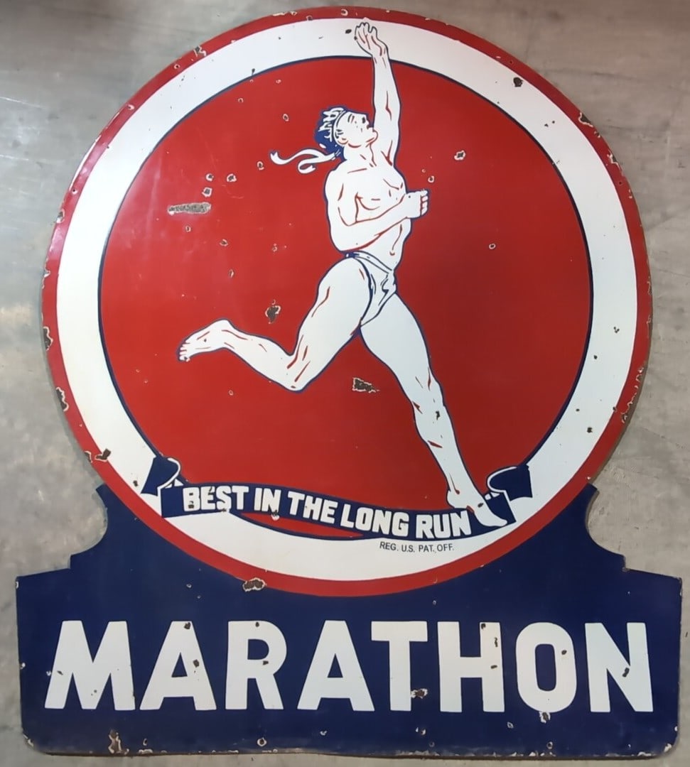 Porcelain Marathon Mile-Marker SignMar 08, 2026Marathon Best in the Long Run DSP Advertising SignMar 21, 202648" Marathon Products DSP Advertising SignMar 21, 202630" Marathon Products DSP Advertising SignMar 21, 2026Marathon Products "Best in the Long Run" w/Logo Porcelain Sign (48) (TAC)Mar 25, 2026Marathon Service Station Light Up Single Sided Plastic SignMar 20, 2026Marathon "Best In The Long Run" Station Identification Sign W/ Running Man GraphicMar 25, 2026Marathon Gasoline Embossed Tin Sign W/ Running Man GraphicMar 25, 2026Marathon Waring Pipe Line Metal SignMar 25, 2026Porcelain 2-sided Mustang Oil SignMar 08, 2026Pan-Am Porcelain Identification Sign (TAC)Mar 26, 2026Marathon Ethyl w/Running Man Logo Porcelain Sign (30) (TAC)Mar 25, 2026Porcelain Flying A Gasoline Pump PlaqueMar 08, 2026"Good Old B.L. Tobacco" Single-Sided Porcelain SignMar 14, 2026Porcelain Great Northern Railway SignMar 08, 2026White Mule Gasoline Porcelain SignMar 16, 2026