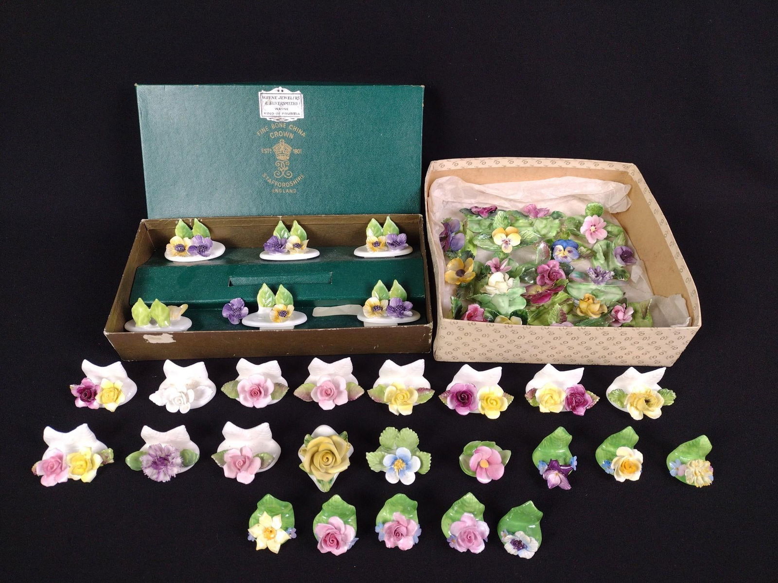 Sold21 PCS PORCELAIN PLACECARD HOLDERS, COALPORTBritish and German, 20th century. Group of twenty-one porcelain place card or menu holders comprising twelve Coalport floral (w. 2") and nine flower pots marked "Germany" (h. 2.75"). Appropriately marSee Sold Price