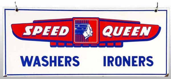 SoldSpeed Queen Reverse On Glass Advertising Neon Sign..A very nice displaying piece rare advertising Speed Queen Washers, Ironers & Refrigerators. The glass face is in excellent condition with only a light amount of fading in the colors. The blue neon aloSee Sold Price