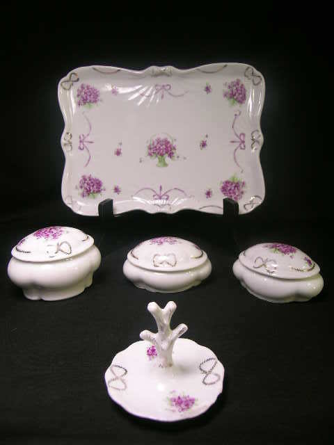 PORCELAIN VANITY SET VIOLET FLOWER PATTERN 5 PC