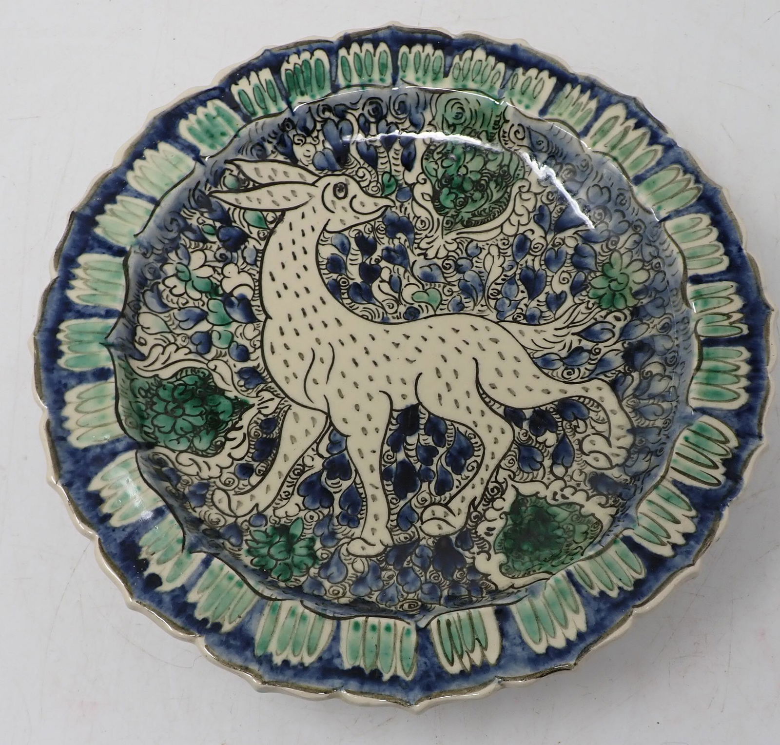MICHAEL ANDERSEN Glazed Pottery Charger. Art Deco relief carved Diana and Deer. Marked MAS 3 herringMICHAEL ANDERSEN Glazed Pottery Charger. Art Deco relief carved Diana and Deer. Marked MAS 3 herring shield mark; 4889 Dimensions: H: 13.25 inches: W: 13.25 inches: D: 3 inches --- -- We offer curbsid