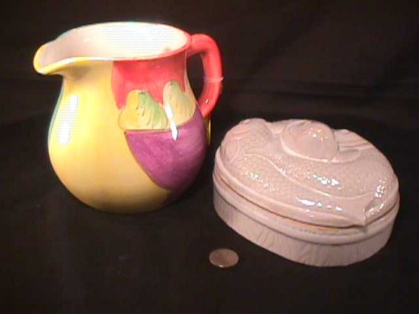 POTTERY FISH DISH FRUIT DECORATED PITCHER