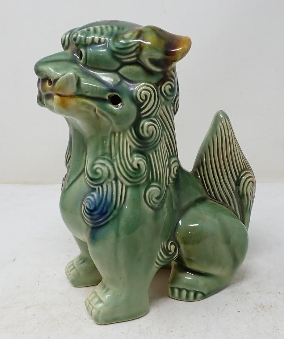 SoldLarge Chinese Green Glaze Pottery Foo Dog StatueVintage early to mid 20th century Chinese export pottery Foo Dog statue. Very nice expressive design in rich green glaze with blue and light yellow highlights. Measures 27 1/2" x 24" Good condition wiSee Sold Price