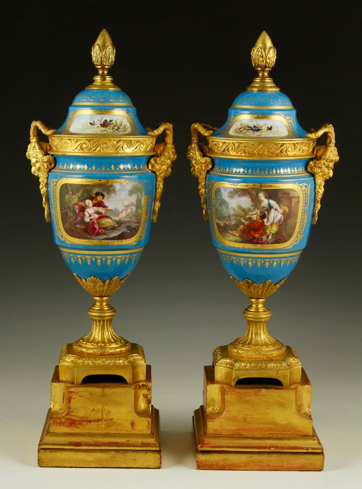 SoldPR SEVRES BRONZE MOUNTED PORCELAIN VASESPr of 19th c. French Porcelain Covered Urns, with gilded bronze inserts, lion head side handles, lid finials and bases, each with hand painted panels - one side with court scene decoration signed "CagSee Sold Price