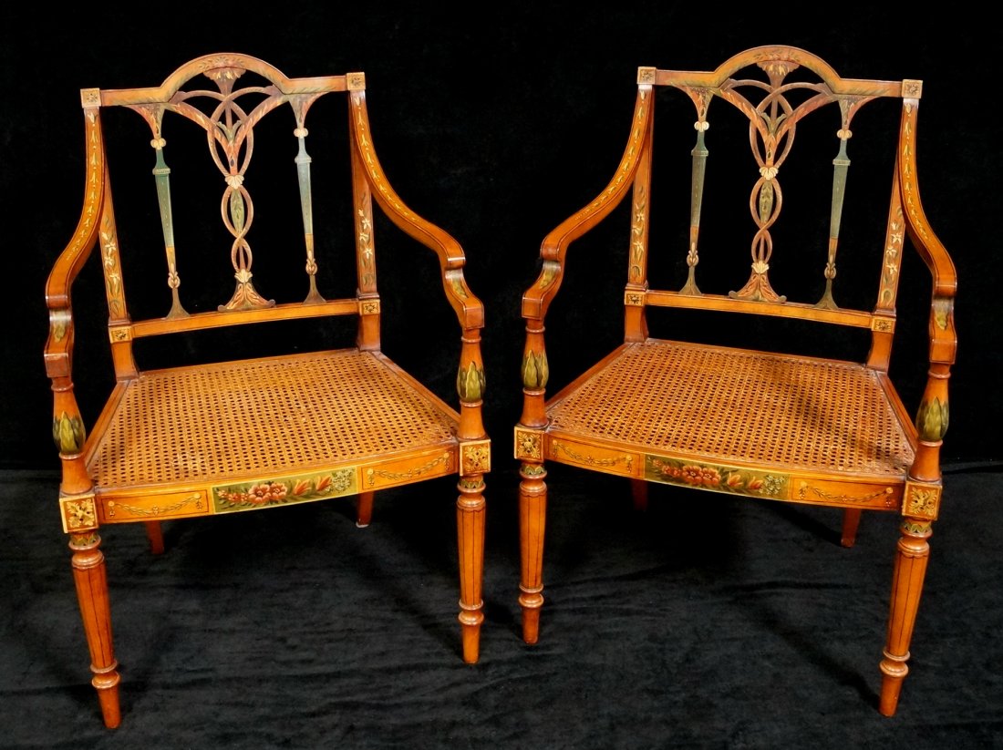 SoldPair of Adams Style Paint Decorated Satin Wood Cane Seat & Back Arm ChairsPair of Adams Style Paint Decorated Satin Wood Cane Seat & Back Arm Chairs. 36 1/2" H "ALL DESCRIPTIONS AND ANY CONDITION STATEMENT GIVEN BY LANGSTON AUCTION GALLERY ARE STRICTLY OPINIONS AND LANGSTONSee Sold Price
