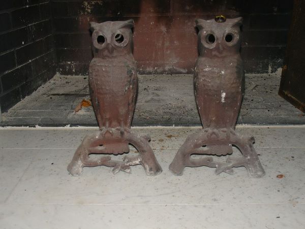 PR. ANTIQUE OWL FORM ANDIRONS, MISSING 3 GLASS E