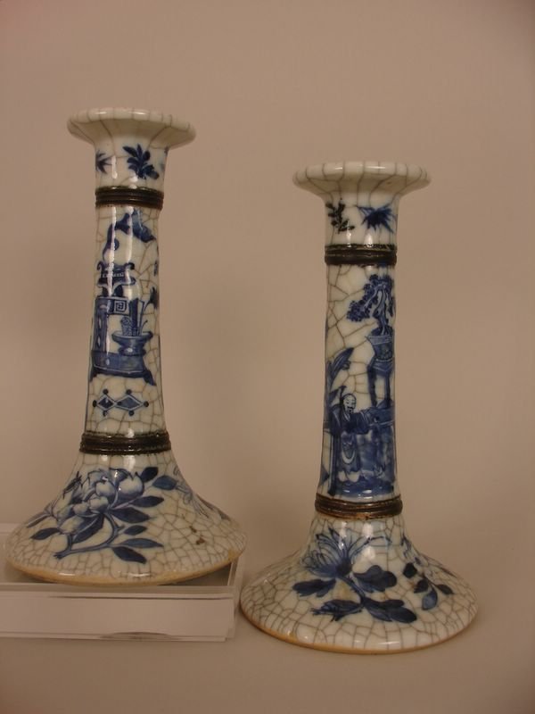 PR. CANTON CRACKLEWARE BLUE & WH. CANDLESTICKS,