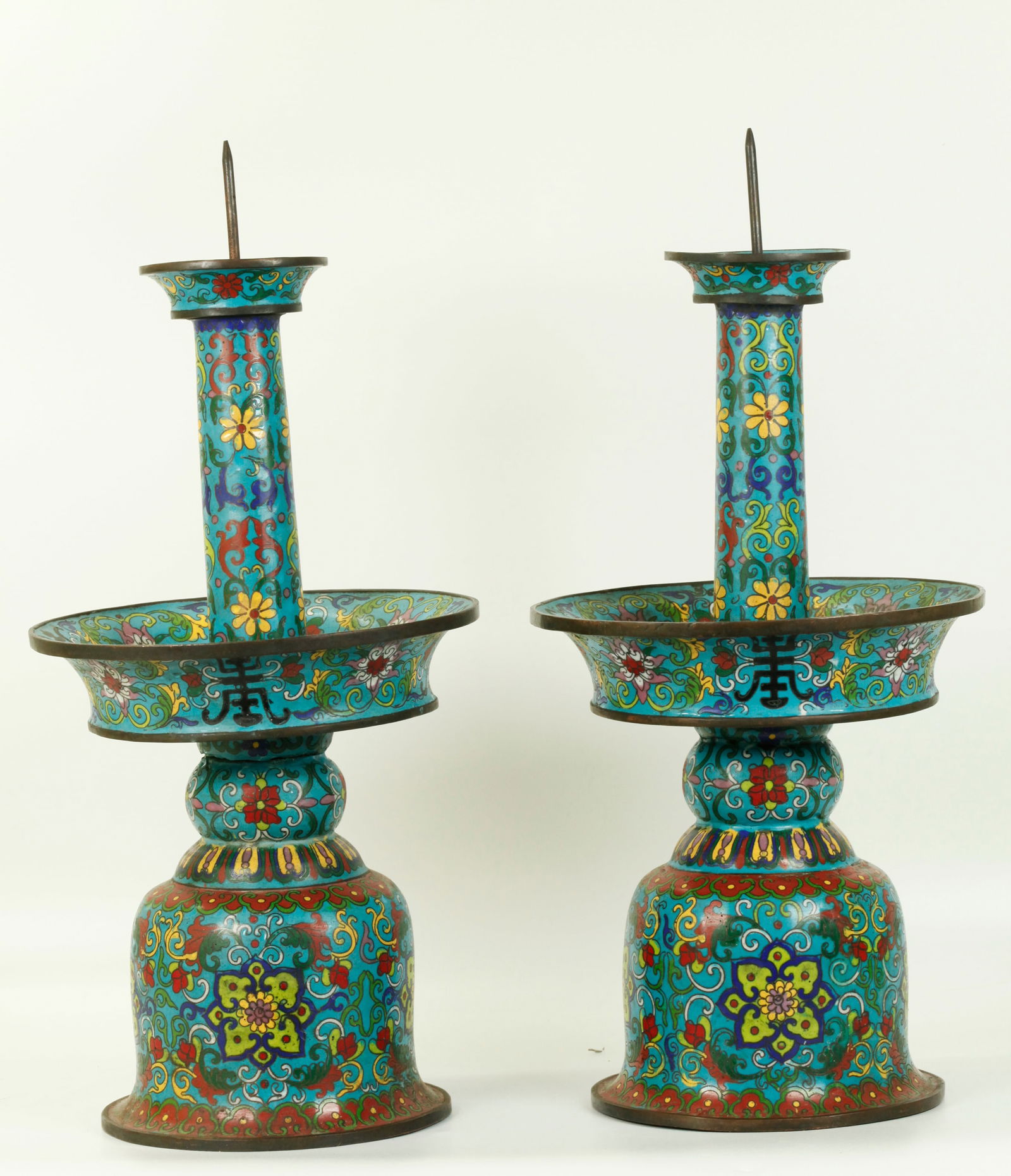 Pr Chinese Qing Cloisonne Altar Candlesticks