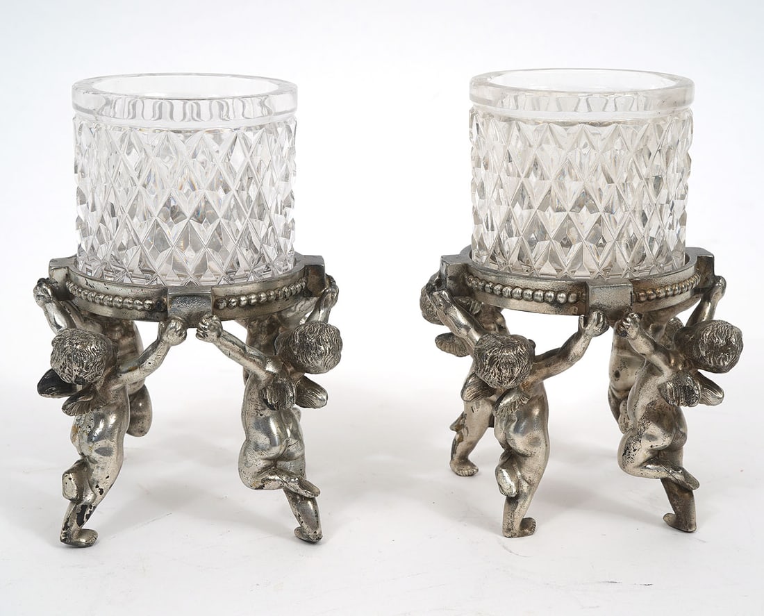 Pr. Crystal and Silver Tone Putti Voltive Holders